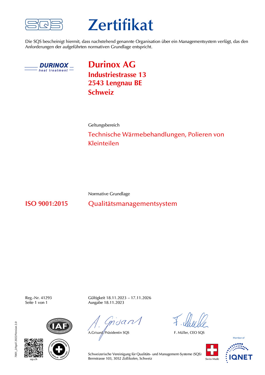 Die Qualitätsprozesse nach ISO 9001:2015 sind bei der Durinox AG eine Selbstverständlichkeit. Das eigene Prüfcenter, ein geschultes und auf Qualität sensibilisiertes Team und das grosse Know-how des Unternehmens bei der Wärmebehandlung von korrosionsbeständigen Stählen sind Garant dafür, dass Sie bei der Durinox AG genau die geforderte Qualität erhalten.
